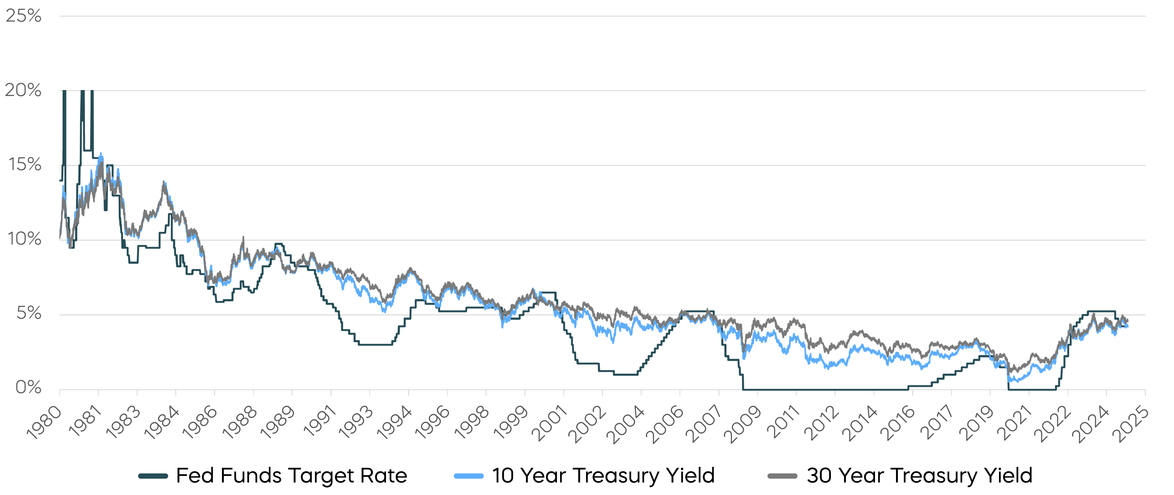 While bond yields had been on a downward trajectory dating back to 1981, they hit historically low levels in 2020 as a result of the pandemic’s impact on the economy and financial markets. The Federal Reserve lowered the Fed Funds target rate to 0.00–0.25%. In 2020, 10- and 30-year Treasury yields fell as low as 0.51% and 1.00%, respectively.[1] This had many investors wondering how much lower yields could go. It also presented challenges for investors managing fixed income exposure and portfolios. Treasury yields subsequently rose off the historically low levels as the economy recovered with the help of supportive monetary and fiscal policies. In the first half of 2022, the Fed started pursuing tighter monetary policies amid high inflation, and Treasury yields moved meaningfully higher, which can lead to losses (potentially significant) in bond portfolios. Intermediate and long-term U.S. Treasury indexes declined 11% and 22%, respectively, for the first half of the year.[2] These losses came at a time where equities also suffered, leaving many investors relying on traditional diversification with stocks and bonds with meaningful losses in their portfolios. More recently, over the last 12- months, as of 3/31/2025, 10-year Treasury yields fluctuated from a low of 3.62% to a high of 4.79%, due in part to growing macroeconomic uncertainty and worries over the impact of increasing tariffs on global trade.[3]