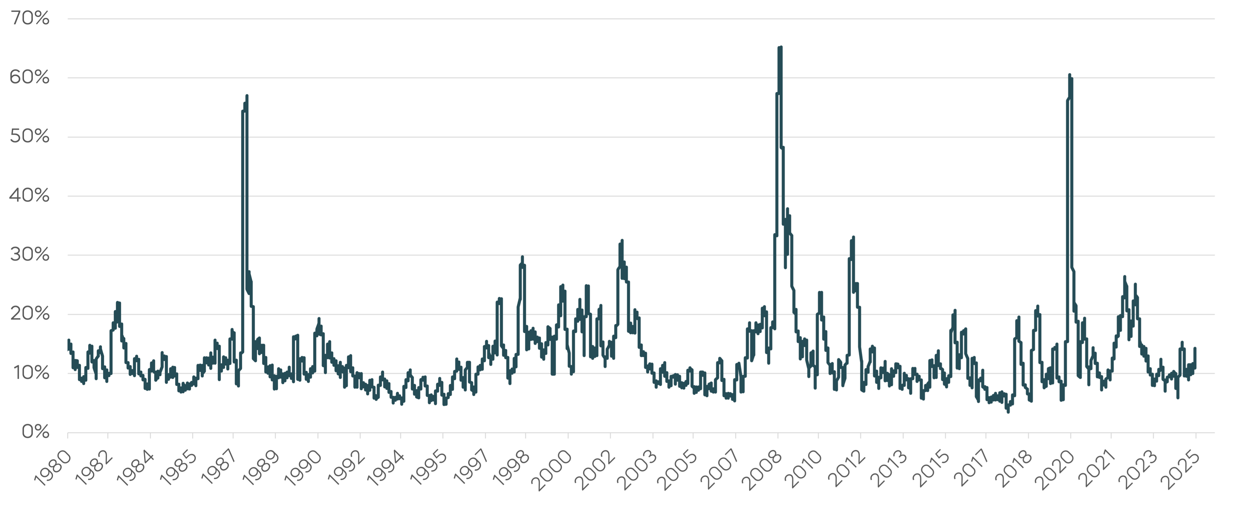 Source: Bloomberg, as of 3/31/2025. Calculated as the standard deviation of 3- month (63 trading days) rolling returns based on daily S&P 500 returns, annualized to 252 trading days in a year.