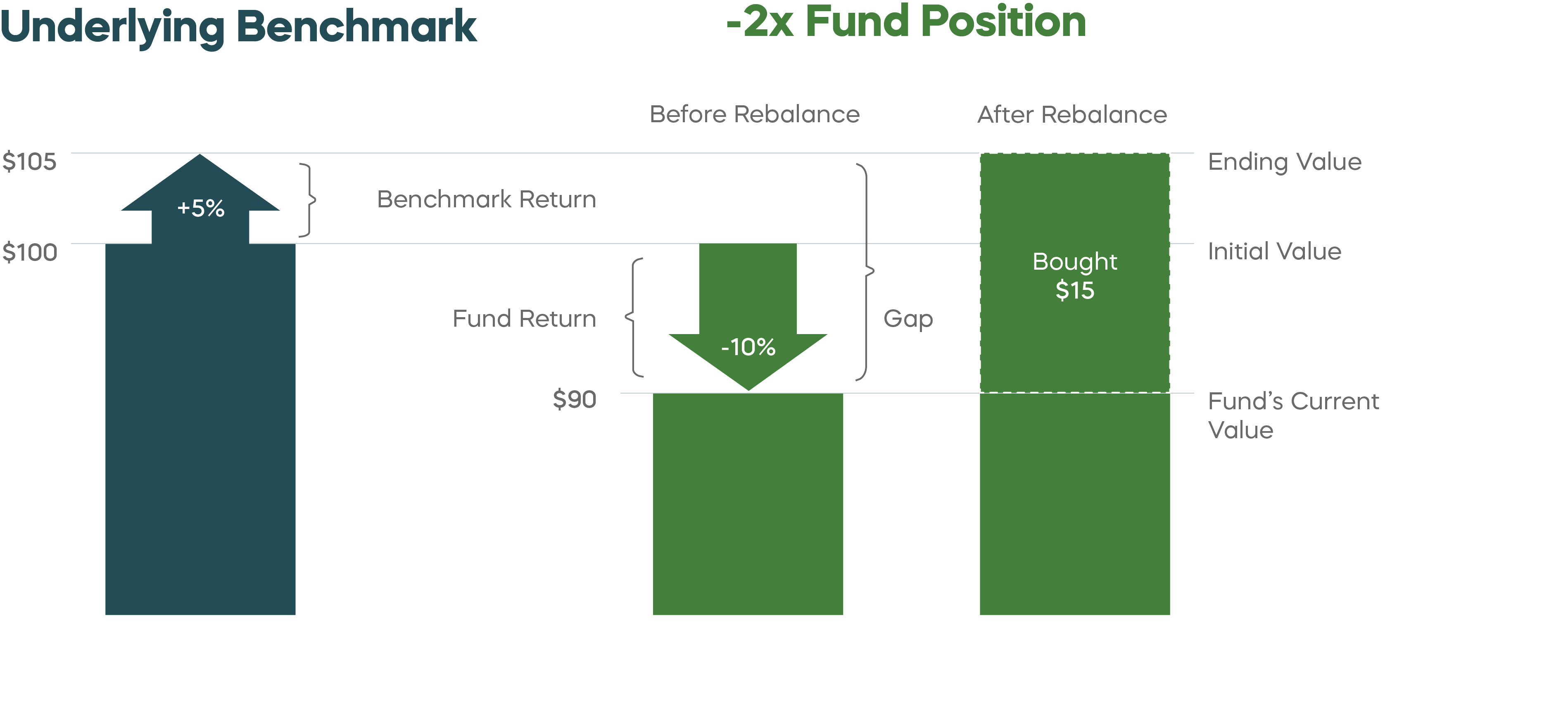 Rebalancing involves periodically adding to or trimming an investment in a fund to reduce the difference between the benchmark’s return and the fund’s return over time—sometimes called the "gap"—to help keep exposure in line with the fund’s stated objective. Rebalancing can buffer the negative effects of compounding during volatile periods, but it can also reduce the positive effects of compounding during trending periods. In addition, because rebalancing involves buying and selling shares, it may require additional cash and can result in transaction costs and tax consequences.