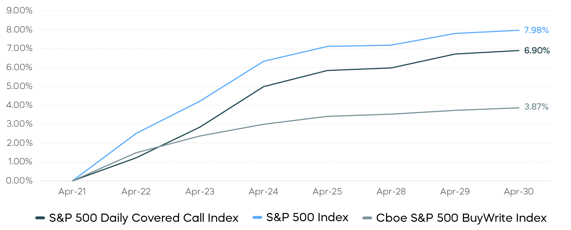 Case in point: Traditional monthly covered call strategies, which collect premiums in exchange for limits on upside returns (and that are mistakenly touted as defensive investments), may sacrifice critical gains when markets rise. The Cboe S&P 500 BuyWrite Index—a monthly covered call index—has returned less than half of the S&P 500’s end-of-April rally. Meanwhile, the S&P 500 Daily Covered Call Index, which tracks the performance of a covered call strategy driven by daily options, has delivered double the return of the Cboe index in this rebound.[5] In short, it’s important to know what you own.