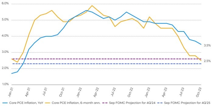 In the September Federal Open Market Committee (FOMC) summary of economic projections, the Fed projected core Personal Consumption Expenditures (PCE)2 inflation to reach 2.6% towards the end of 2024 and 2% only by the end of 2026. These targets appear too conservative to us, as core PCE readings over the last six months have been trending at an annualized rate of 2.5%, already below the Fed’s projection in a year’s time. Goods inflation this year, excluding food and energy, has averaged an annualized rate of just 0.7%. The inflation rate has been mostly held up by services, which make up about two-thirds of the price index