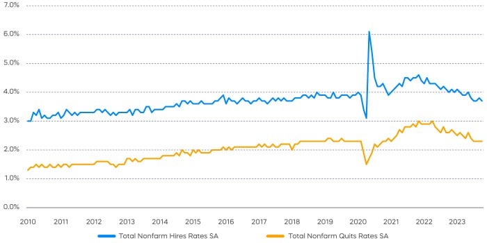 One source of caution for the Federal Reserve to resist declaring victory on inflation is the scenario of a wage-inflation spiral. A high job openings rate, although down from its post-pandemic peak, has been often cited as a sign of a tight labor market. Anecdotally, there has also been a higher number of labor union strikes. On the other hand, hires and quits rates have already reverted back to pre-pandemic levels.