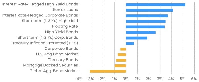 The different market segments represented in the fixed income returns charts use the following indexes: Global Agg Bond Market: Bloomberg Global-Aggregate Total Return Index Value Unhedged USD; Mortgage Backed Securities: Bloomberg U.S. MBS Index Total Return Value Unhedged USD; Treasury Bonds: Bloomberg U.S. Treasury Total Return Unhedged USD; U.S. Agg Bond Market: Bloomberg U.S. Agg Total Return Value Unhedged USD; Corporate Bonds: Bloomberg US Corporate Total Return Value Unhedged USD; High Yield Bonds: Bloomberg U.S. Corporate High Yield Total Return Index Value Unhedged USD; Interest Rate-Hedged High Yield Bonds: FTSE High Yield (Treasury Rate-Hedged) Index; Treasury Inflation Protected (TIPS): Bloomberg U.S. Treasury Inflation Notes TR Index Value Unhedged USD; Short term (1-3 Yr) High Yield: Bloomberg U.S. Corporate 0-3 Year Total Return Index Value Unhedged USD; Senior Loans: Morningstar LSTA U.S. Leveraged Loan 100 Index; Short term (1-3 Yr) Corp Bonds: Bloomberg U.S. Corporate 1-3 Yr Total Return Index Value Unhedged USD; Floating Rate: Bloomberg U.S. FRN < 5 yrs Total Return Index Value Unhedged USD; Interest Rate-Hedged Corporate Bonds: FTSE Corporate Investment Grade (Treasury Rate-Hedged) Index.