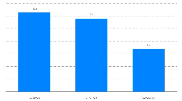 The higher-than-expected Nonfarm Payrolls and Consumer Price Index print for the month of January prompted a rapid change in sentiments around interest rate cuts. The Fed Funds futures market started the year anticipating more than six rate reductions. By the end of February, the market had dialed that back to just over three rate cuts, aligning with the Federal Reserve’s most recent median projection. And some are now suggesting the next policy move could be a rate hike instead, such as former U.S. Treasury Secretary Larry Summers, who sees a “meaningful chance” of a hike happening.[1]