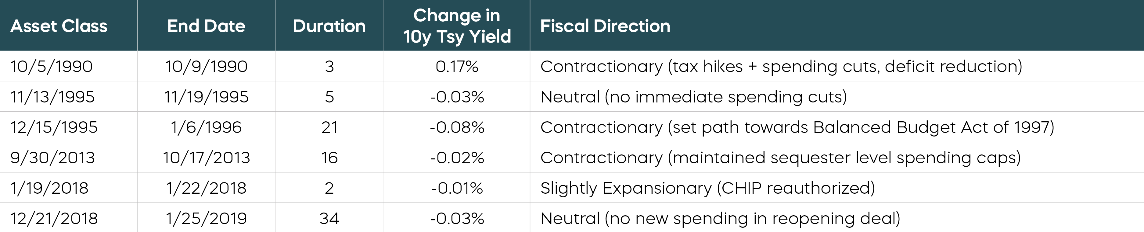 While a shutdown is unlikely to shift medium- or long-term growth prospects, the resulting fiscal policy direction could be more lasting. Historically, most shutdowns have tilted the U.S. toward a neutral or contractionary stance, often reflecting Republican-led efforts to restrain spending. Past demands have included attempts to defund the Affordable Care Act in 2013, the “Contract with America” agenda of 1995–1996, and deficit-reduction negotiations in 1990.