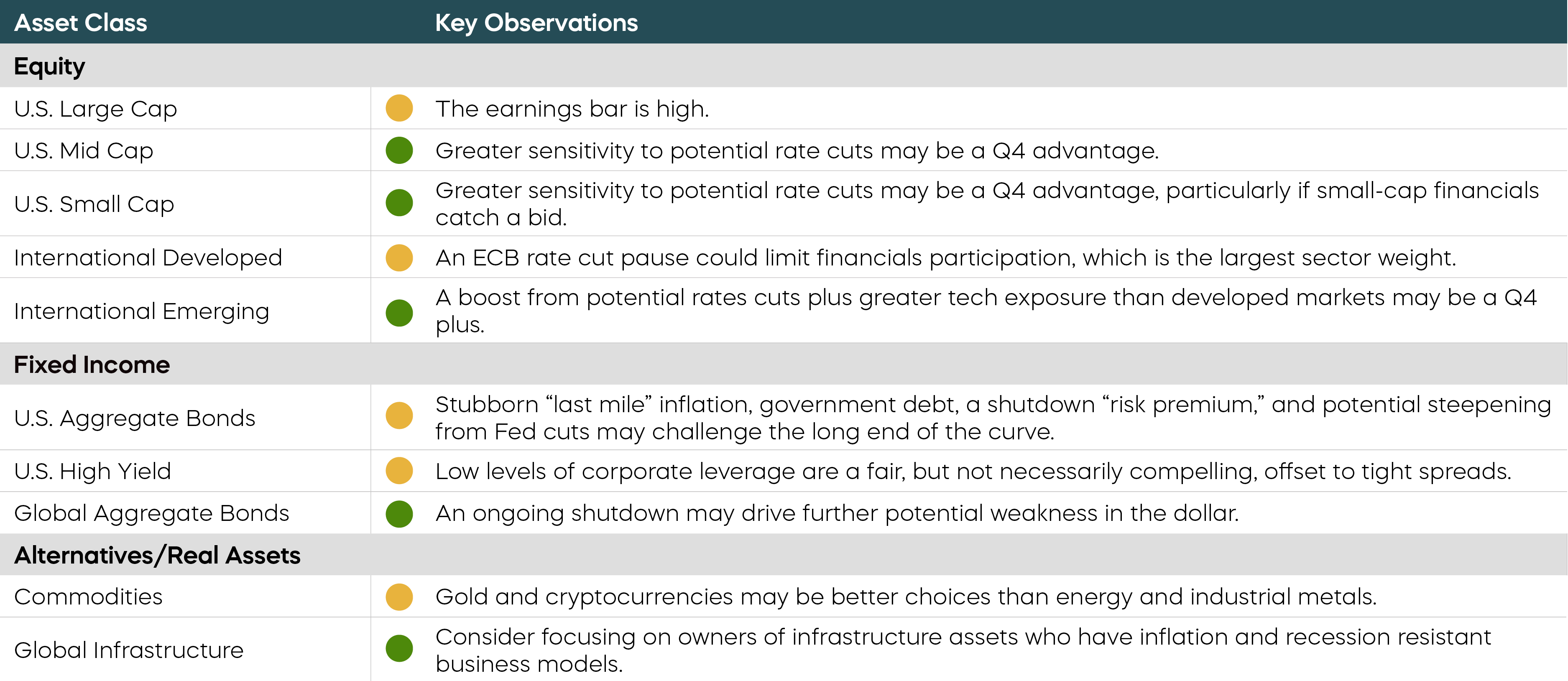 The shutdown also complicates the Federal Reserve’s task. A data-dependent Fed is searching for weakness in the labor market to justify additional rate cuts, but the Bureau of Labor Statistics’ closure will delay jobs reports and revisions at a critical juncture. Meanwhile, markets are pricing in further easing following recent labor market softness. We believe that the Fed will stay on its path of gradual rate reductions into next year, but data gaps due to the shutdown introduce greater uncertainty into the timeframe for potential future cuts.