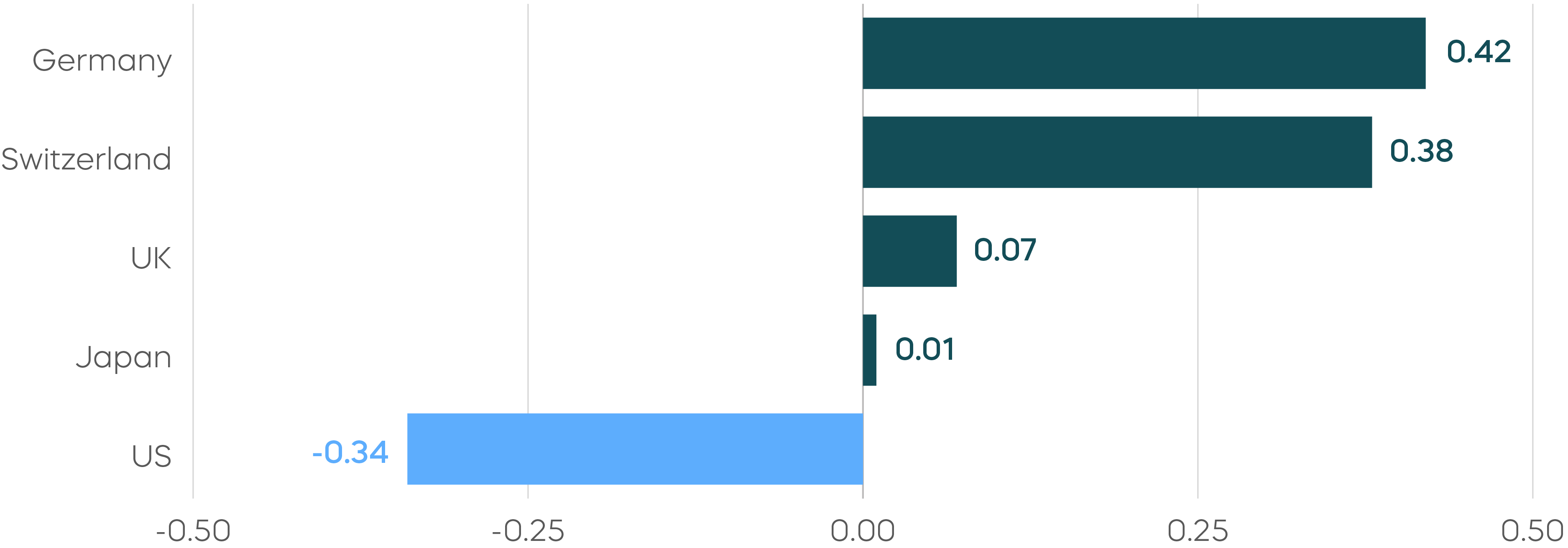 Source: Bloomberg, unhedged 7-10 year government bond total return indexes, weekly returns. Index returns are for illustrative purposes only and do not reflect any management fees, transaction costs or expenses. Indexes are unmanaged, and one cannot invest directly in an index. Past performance does not guarantee future results.