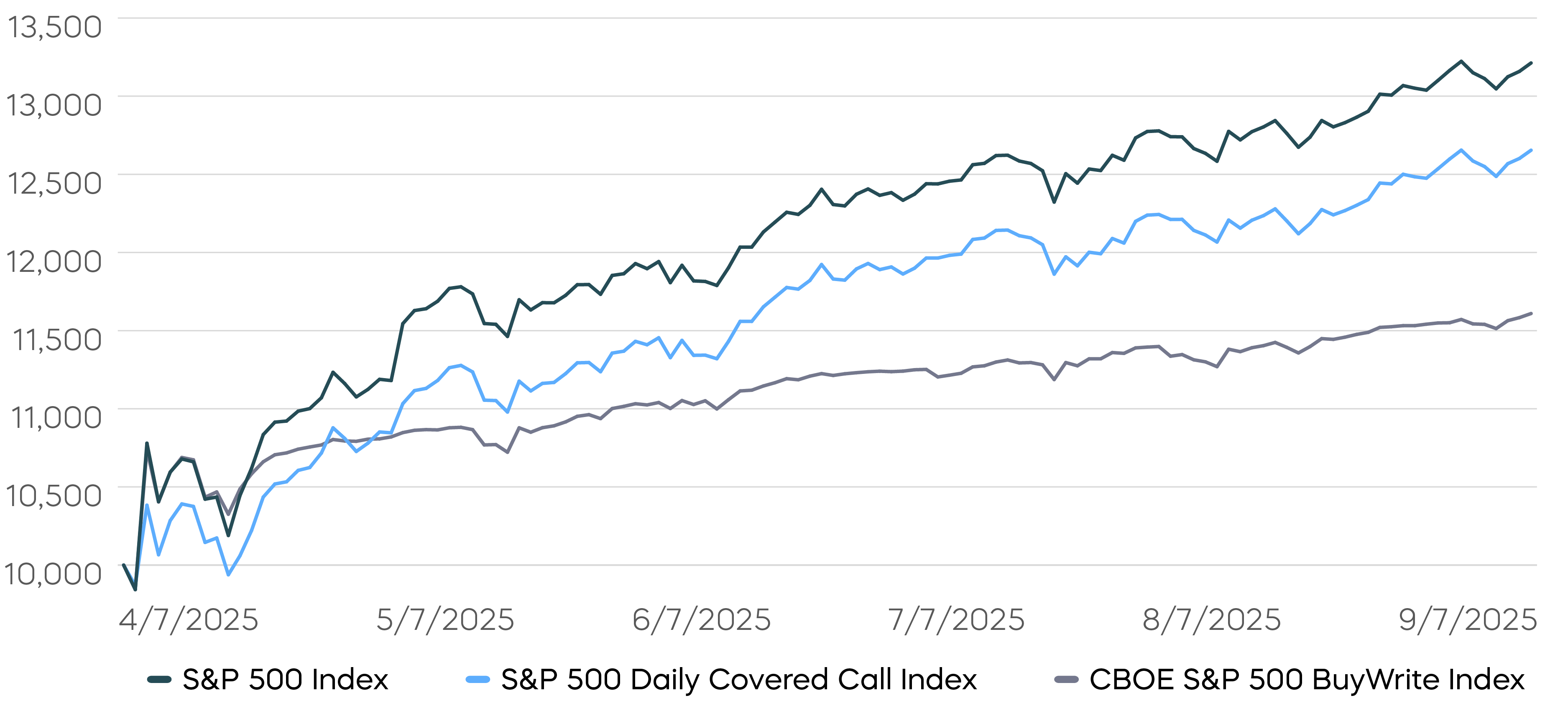 The S&P 500 Daily Covered Call Index seeks to improve upon the tradeoff between generating high levels of income and capturing long-term total returns. Since its inception, the index has captured significantly more of the S&P 500’s total returns, including during the current rally.[5]