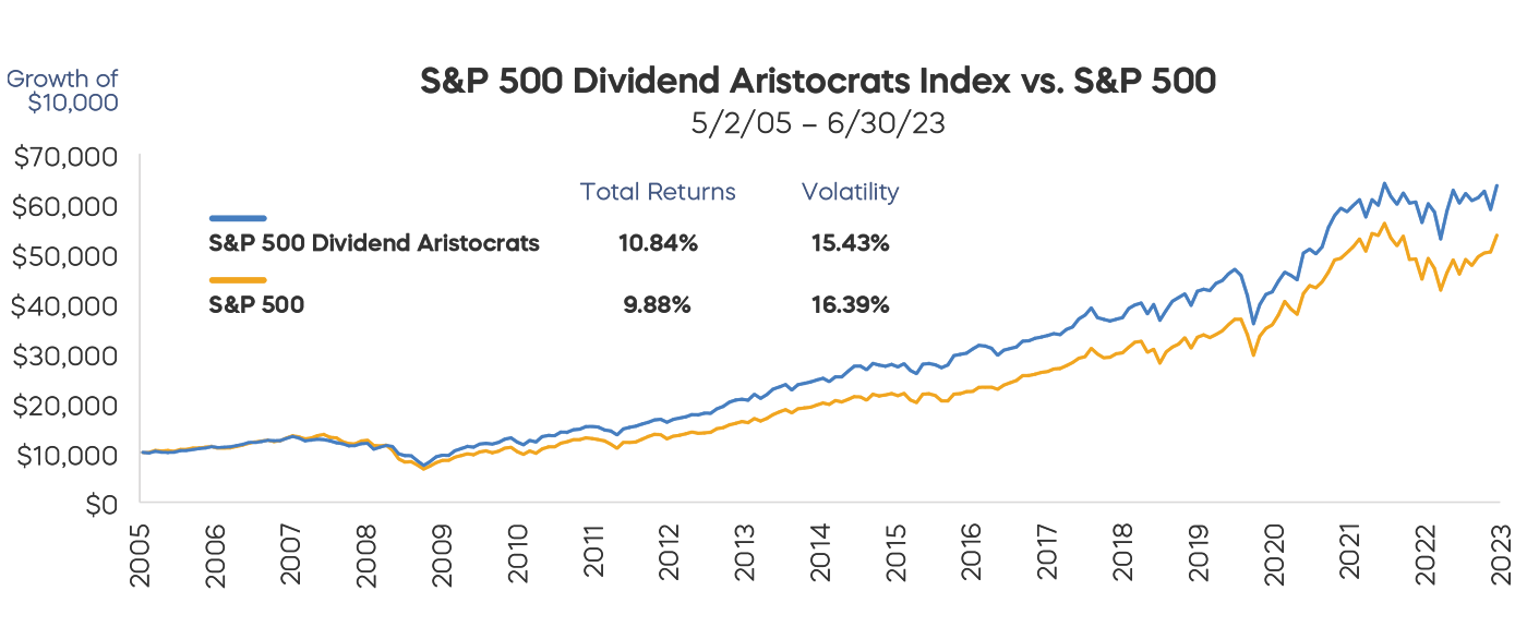 Investment strategies focused on consistent dividend growth have generally outperformed their benchmarks over the long term. For example, one of the most widely followed dividend growth strategies is the S&P 500® Dividend Aristocrats® Index, which focuses on companies with at least 25 years of uninterrupted dividend growth. Since its inception, the index has generally outperformed the S&P 500 on a risk-adjusted basis.