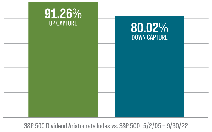 Since its inception, the S&P 500 Dividend Aristocrats Index has captured 87.5% of the market’s gains, while experiencing just 83.7% of the market’s losses—contributing to the long-term outperformance of the strategy.