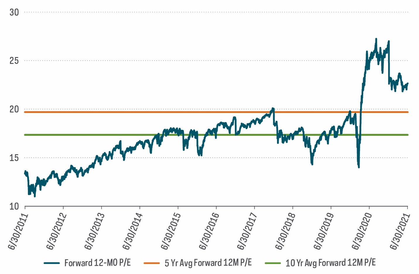 The 10-year average multiple shown below was just over 17x as of 6/30/21. From this vantage point, the current market appears elevated.