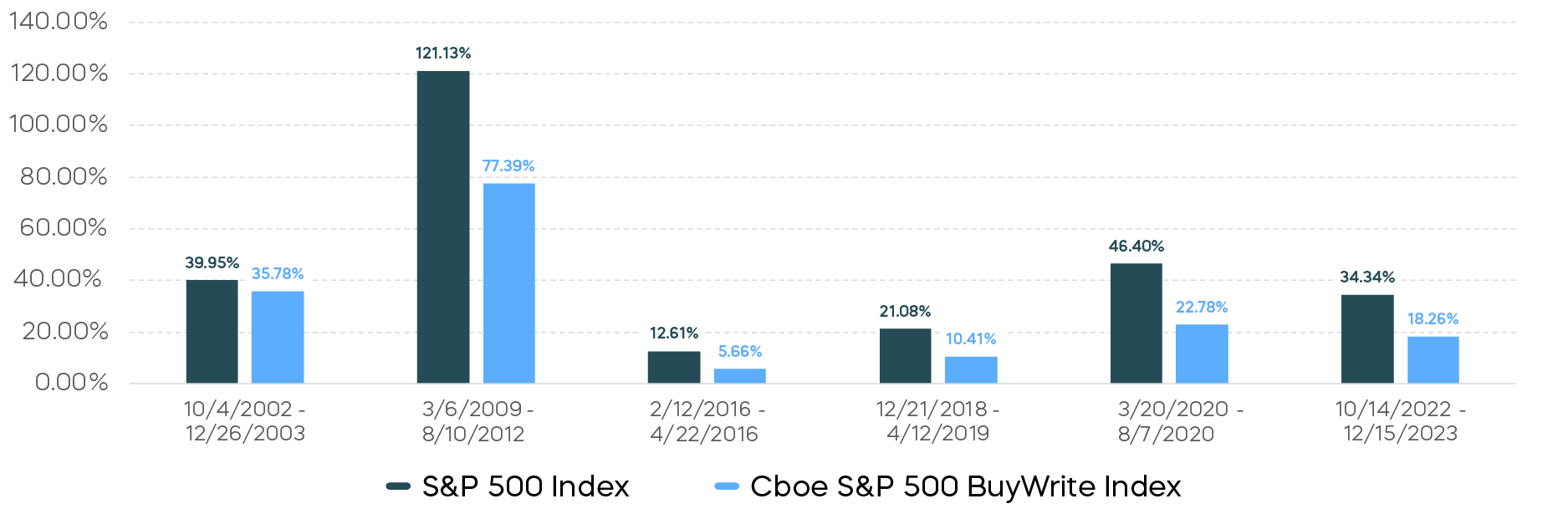 The COVID example is not an anomaly. Since the inception of the Cboe S&P 500 BuyWrite Index in April 2002, there have been six drawdowns of 10% or more from prior highs. During these periods, the Cboe S&P 500 BuyWrite Index captured nearly three quarters of the downside losses of the S&P 500 but returned just a bit more than half of the upside recovery on average.[5]