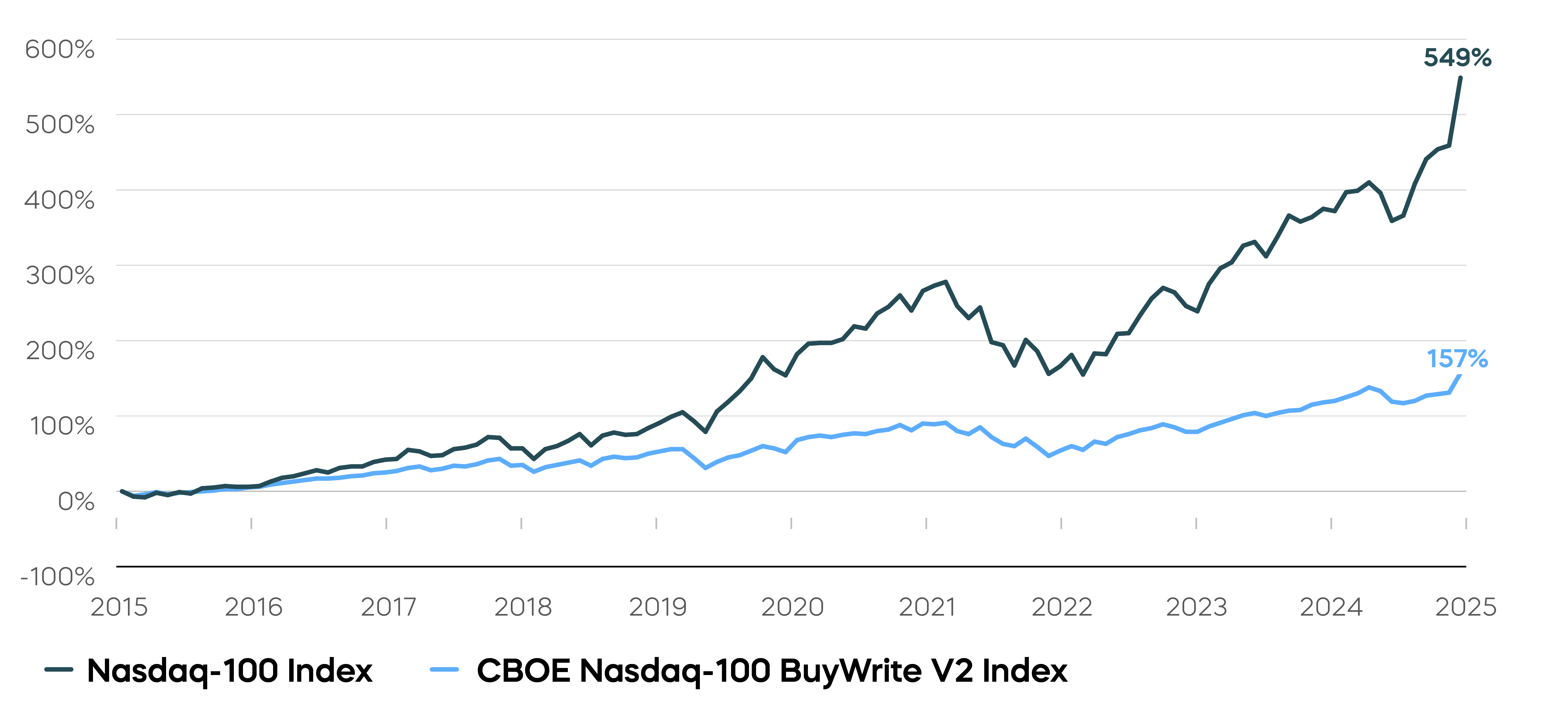 By capping the potential gains of an investment, covered call strategies create an inherent trade-off: The investor receives income from selling calls, but sacrifices long-term growth potential by capping the upside. In the case of traditional covered call strategies, this trade-off can be particularly costly over time.