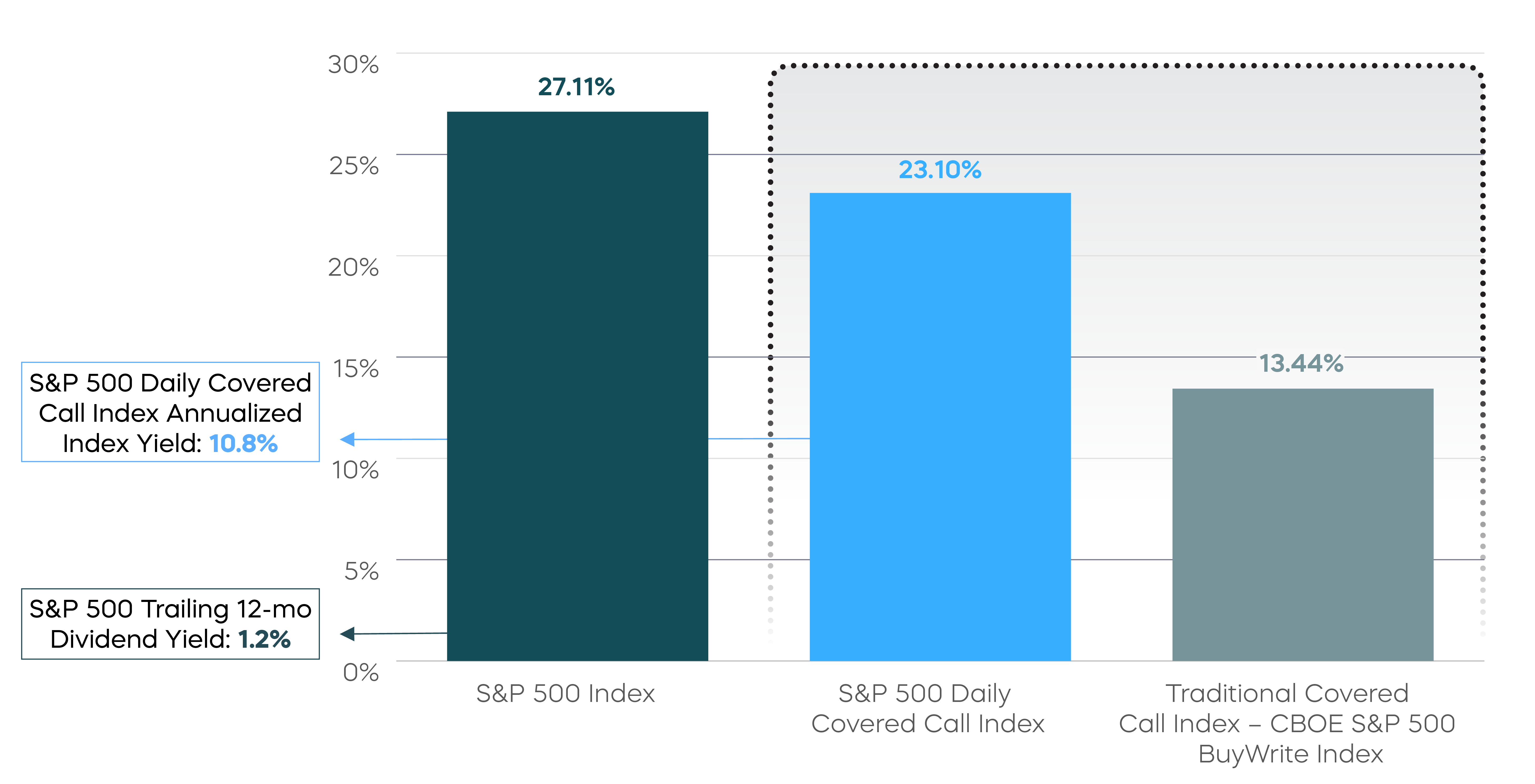 While covered call strategies using daily options are relatively new—the S&P 500 Daily Covered Call Index was incepted in October 2023—comparisons to traditional monthly strategies are compelling.[1]