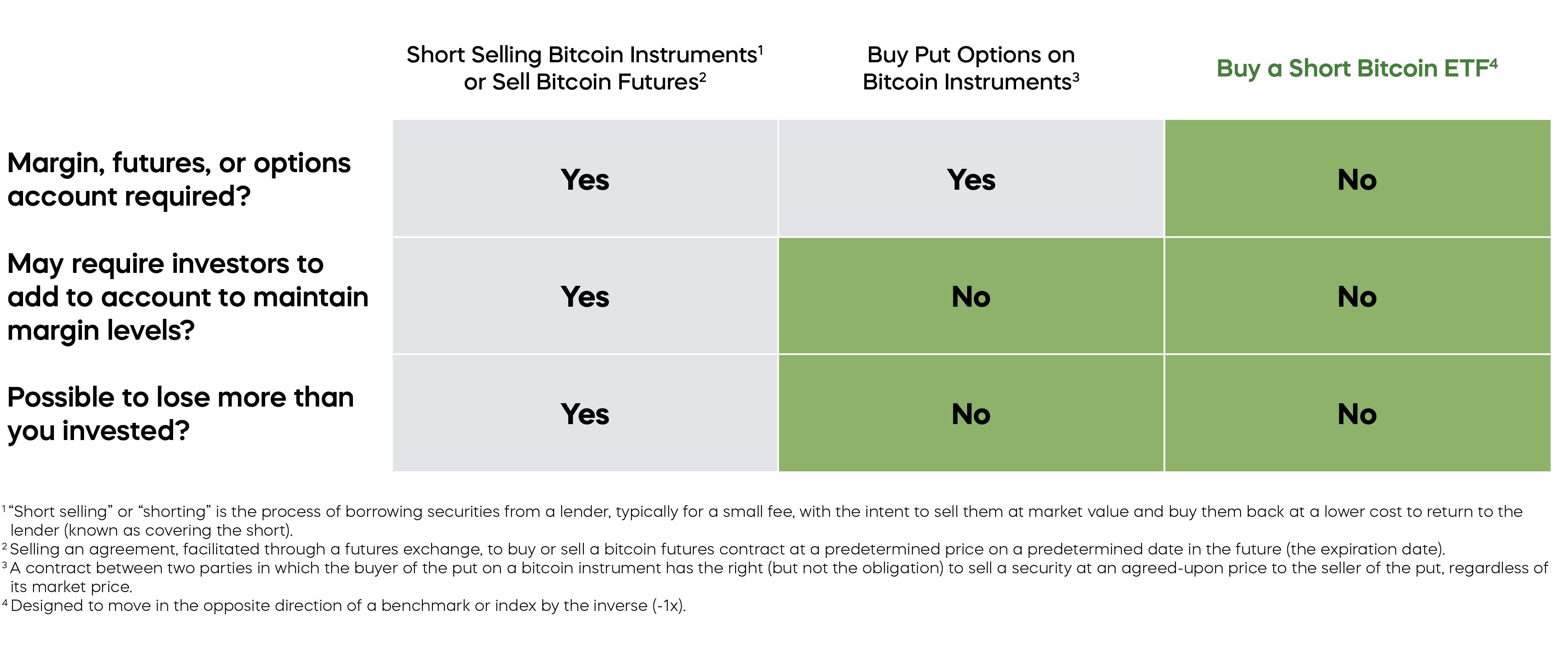 Investing involves risk, including the possible loss of principal. The Fund is non-diversified and entails certain risks, including risk associated with the use of derivatives (e.g., futures contracts and similar instruments), imperfect benchmark correlation, leverage and market price variance, all of which can increase volatility and decrease performance. The Fund should lose money when the daily price of bitcoin futures rises. Please see the summary and full prospectus for a more complete description of risks.